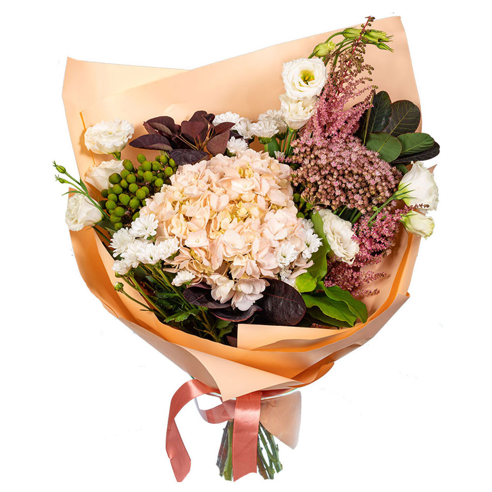 Гортензия кремовая, эустома белая, озотамнус, бруния, зелень. Упаковка (лента, пленка, крафт, сетка, пленка матовая)